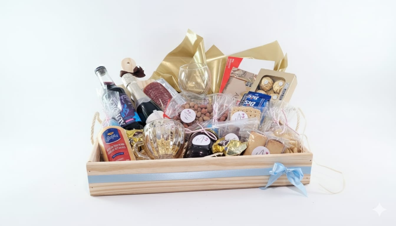Tudo isso apresentado em uma cesta rústica de madeira , laços decorativos e cartão personalizado. Ideal para presentear em ocasiões especiais como aniversários, celebrações corporativas ou datas comemorativas.